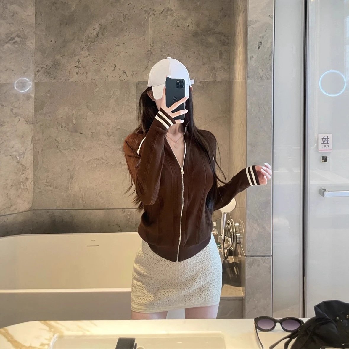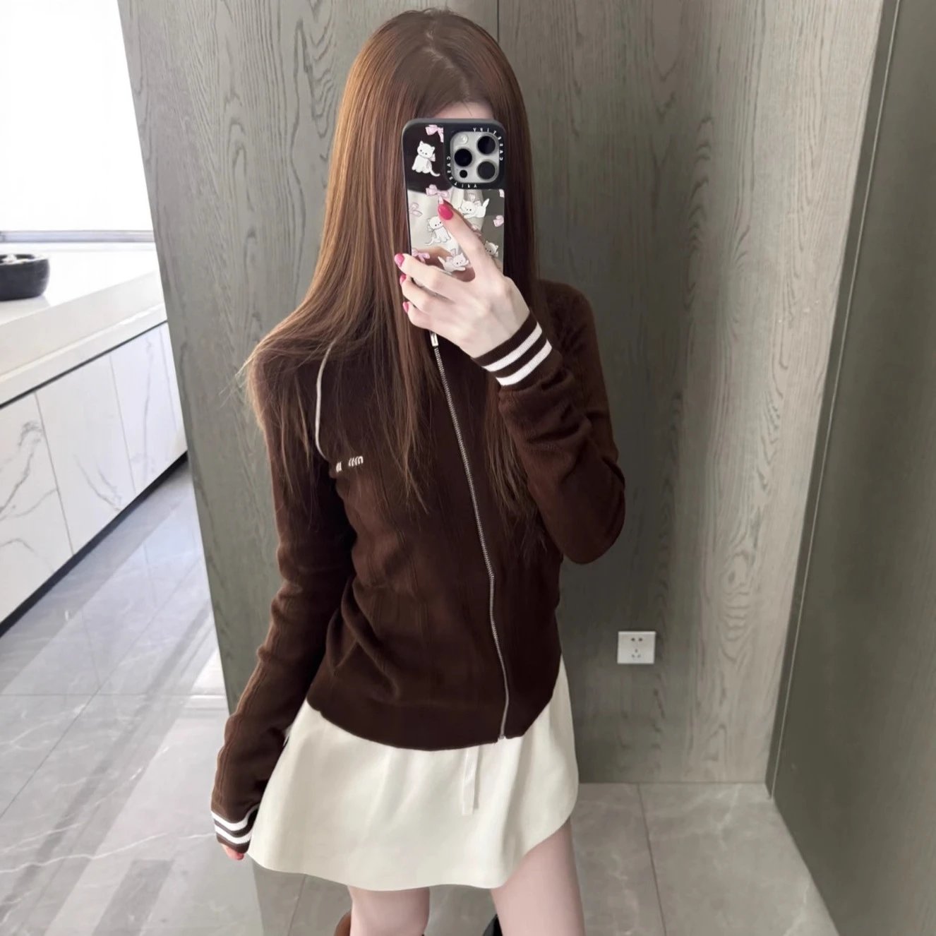 2025早秋新款MIU缪家深棕巧克力色钩花拉链针织衫外套女款