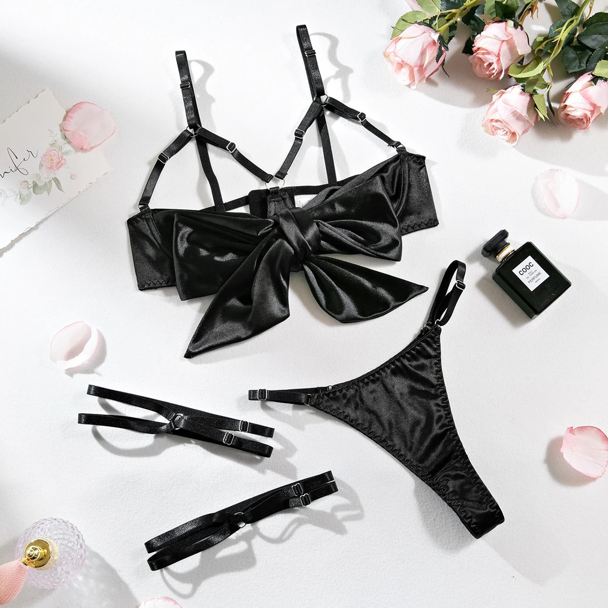 热销情趣内衣钢圈镂空性感露胸色丁绸缎带腿环三件3188
