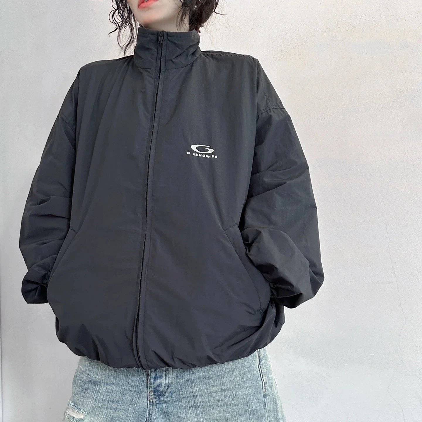 巴黎B家经典款字母LOGO刺绣尼龙高领运动冲锋衣夹克外套