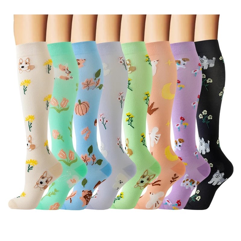 跨境新款花卉压力袜运动骑行护士小腿袜亚马逊压缩中筒及膝袜子