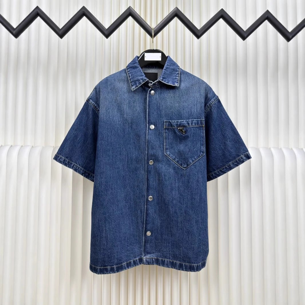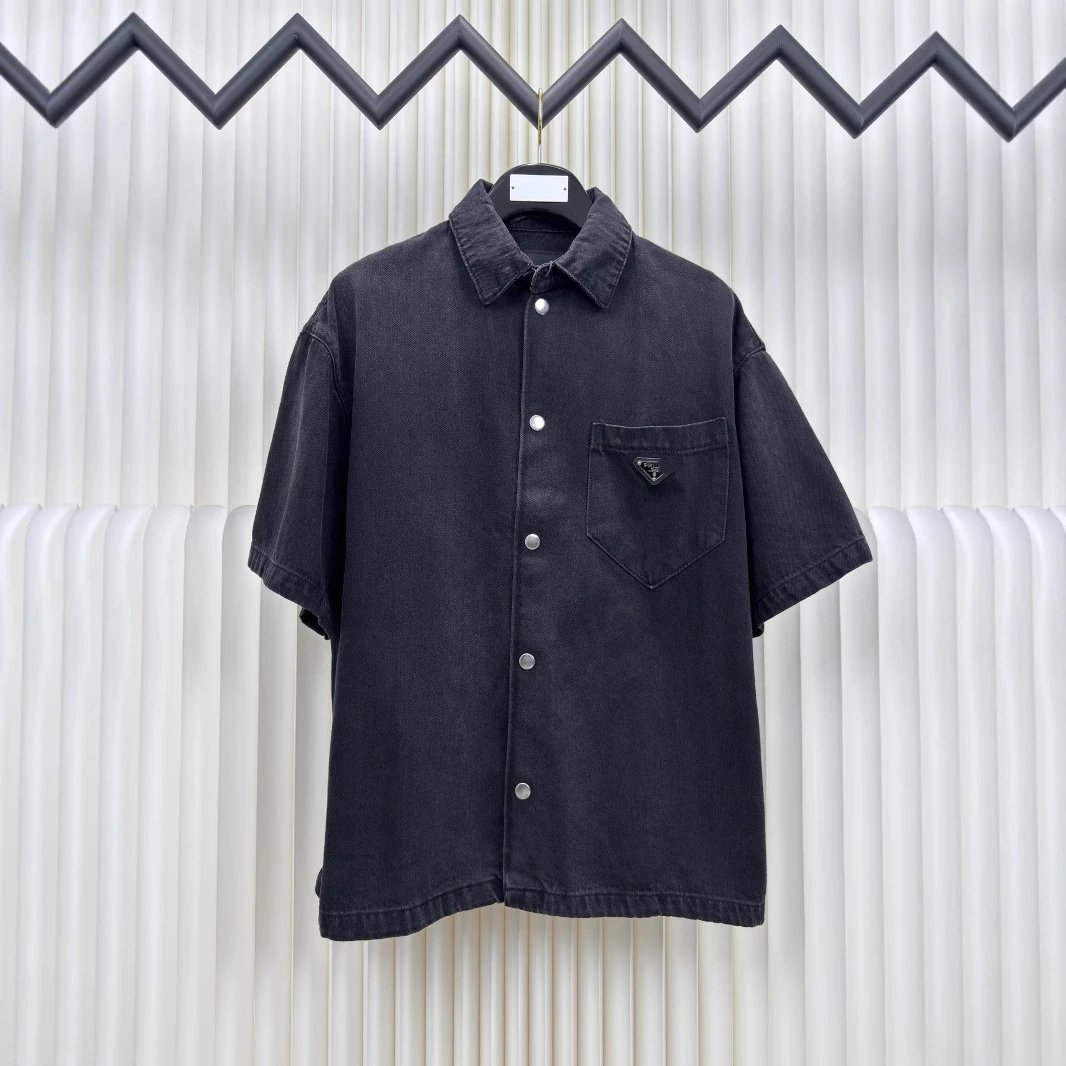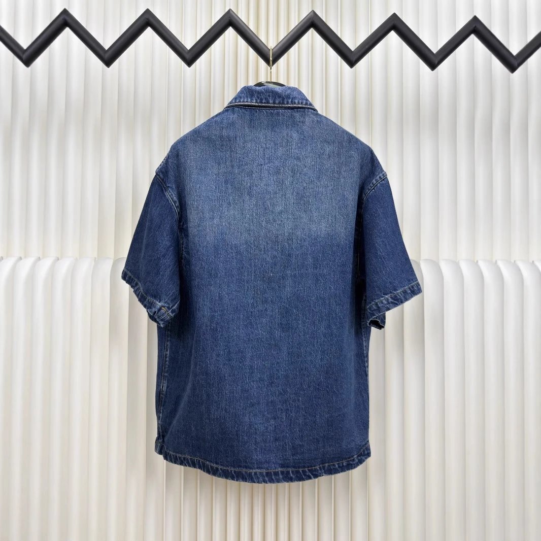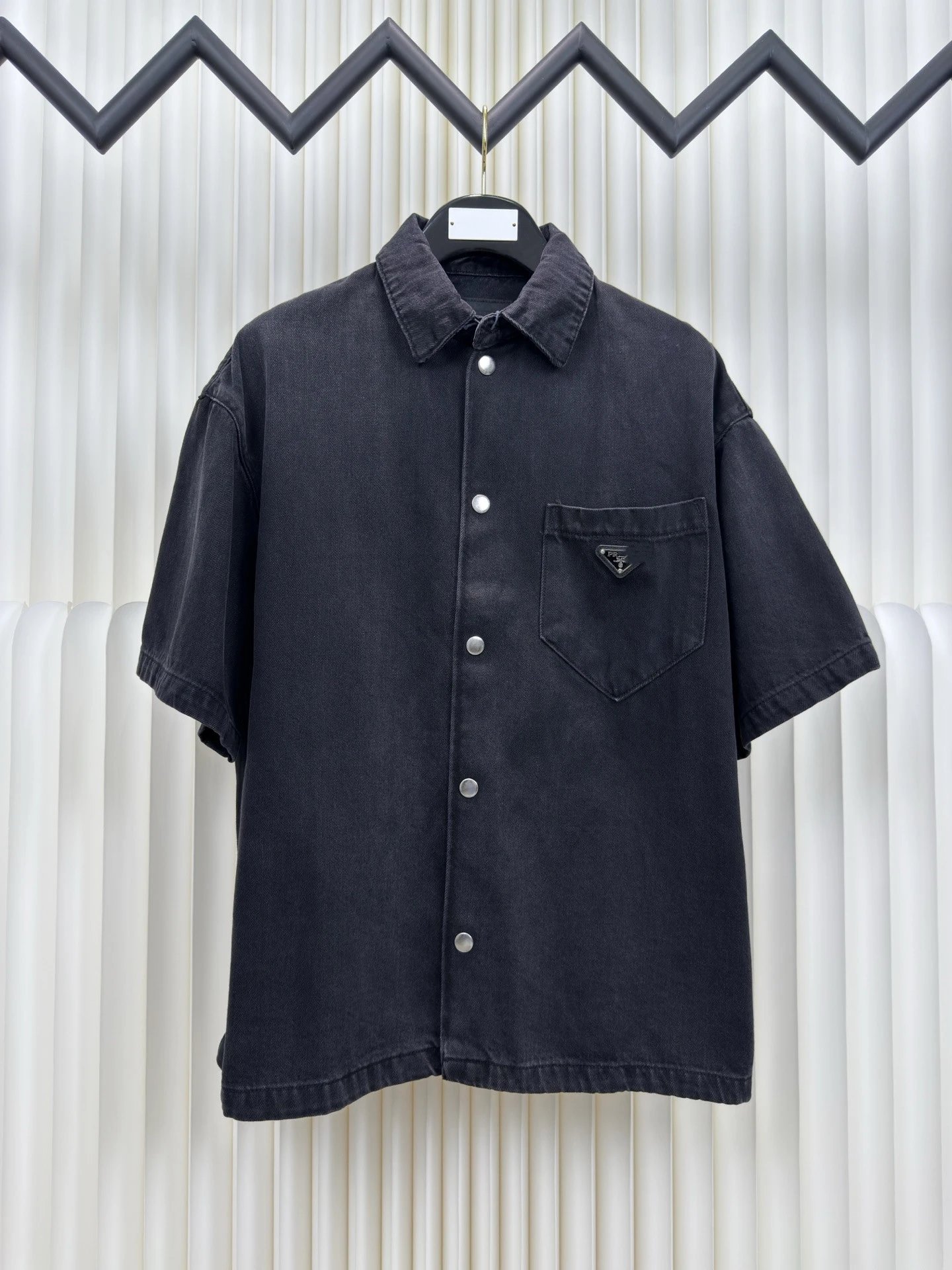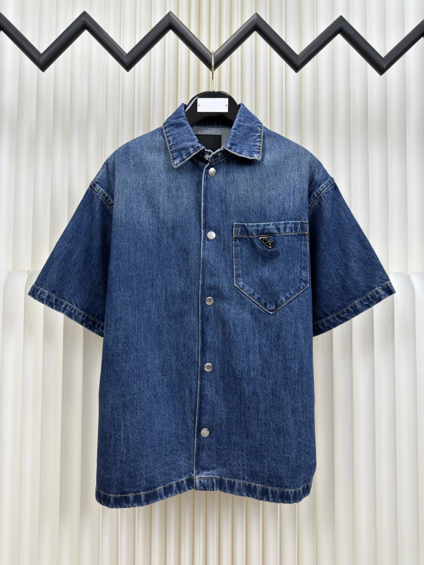 P家网红款三角标水洗牛仔衬衫男女宽松短袖牛仔衣外套