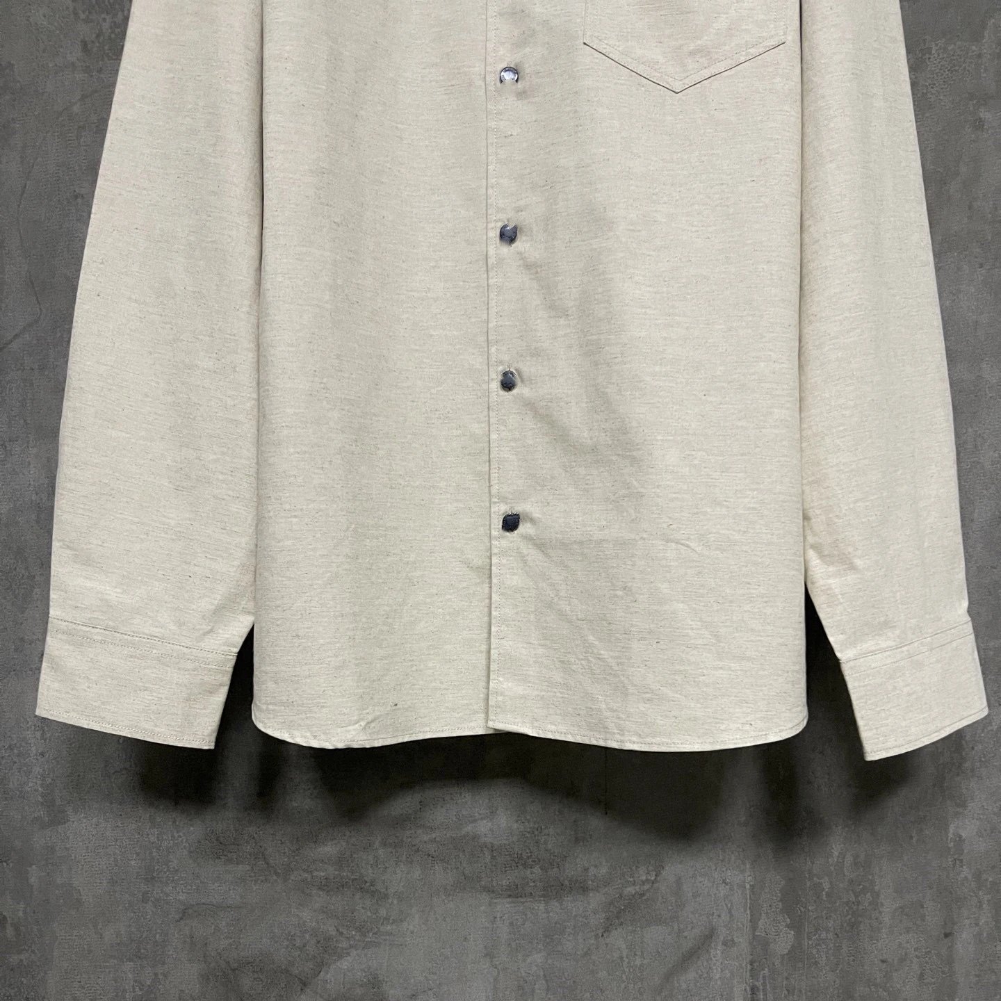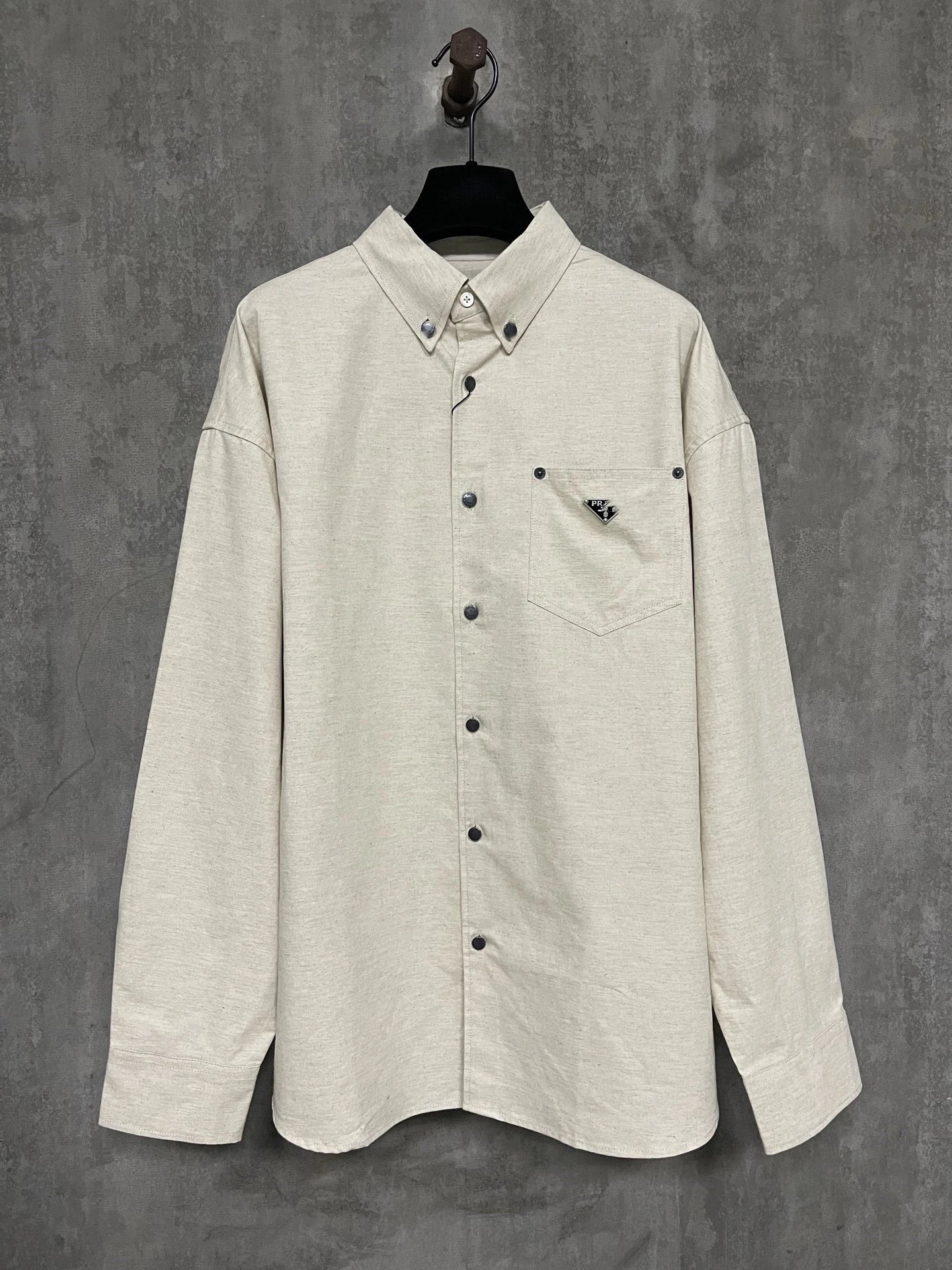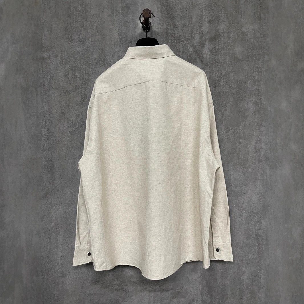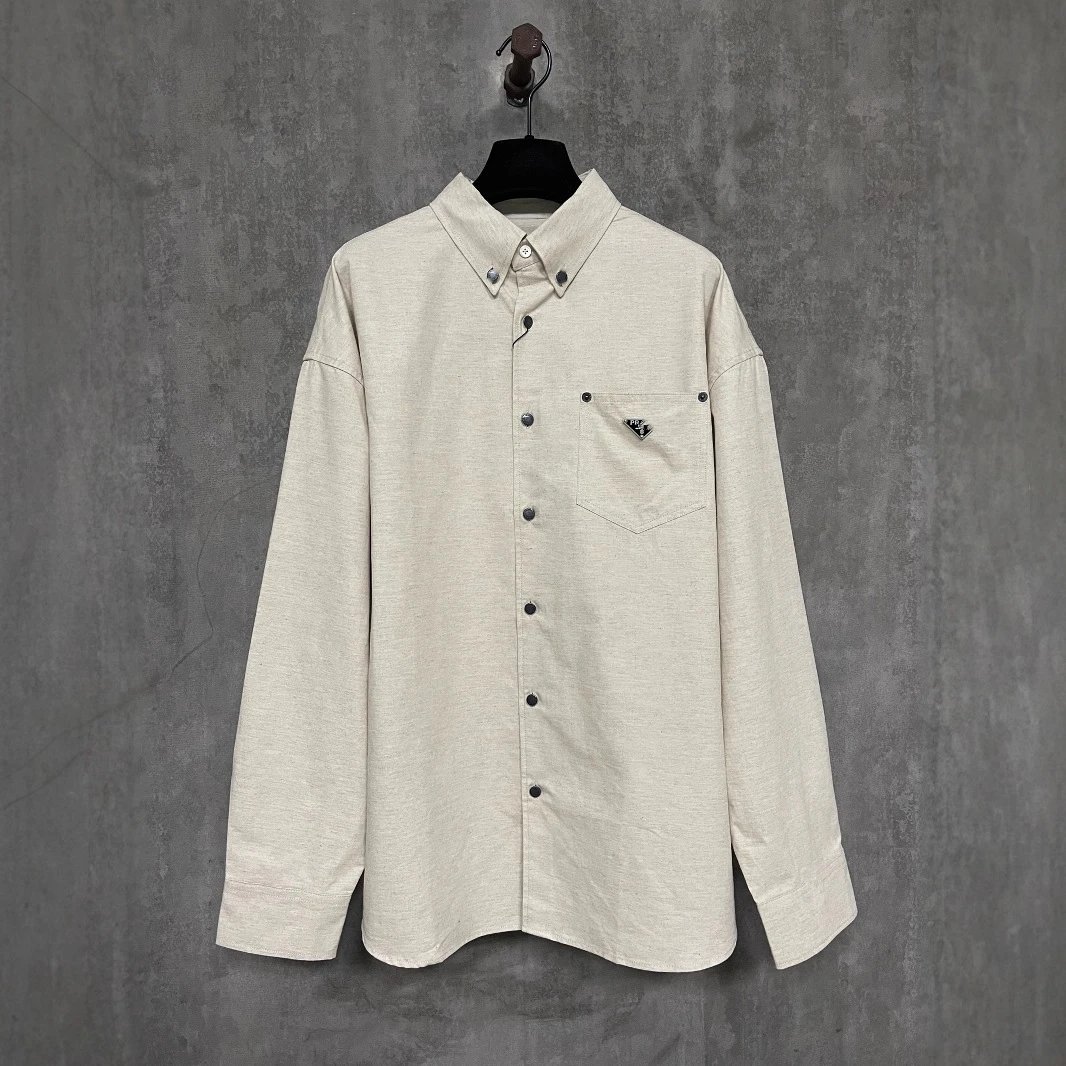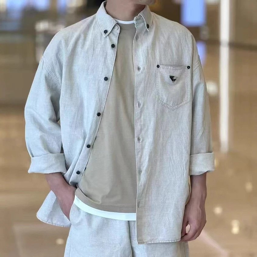 P家纯色三角铁标老钱风纯色长袖亚麻开衫衬衫男女