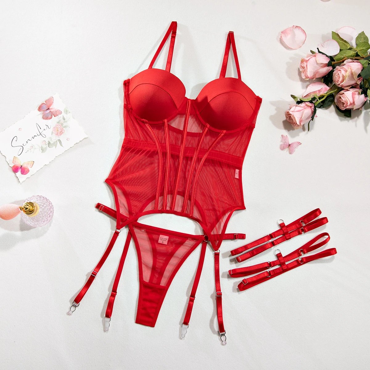 外贸新款舒适网纱透气塑身分体套装钢圈聚拢带腿环